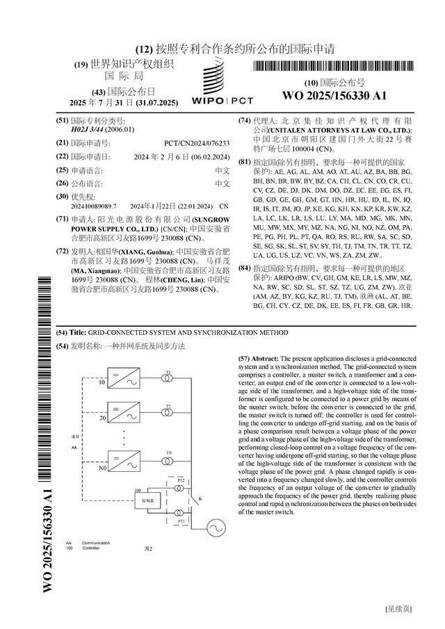 证券之星消息,根据企查查数据显示阳光电源(300274)公布了一项国际专利申请,专利名为“一种并网系统及同步方法”,专利申请号为PCT/CN2024/076233,国际公布日为2025年7月31日。